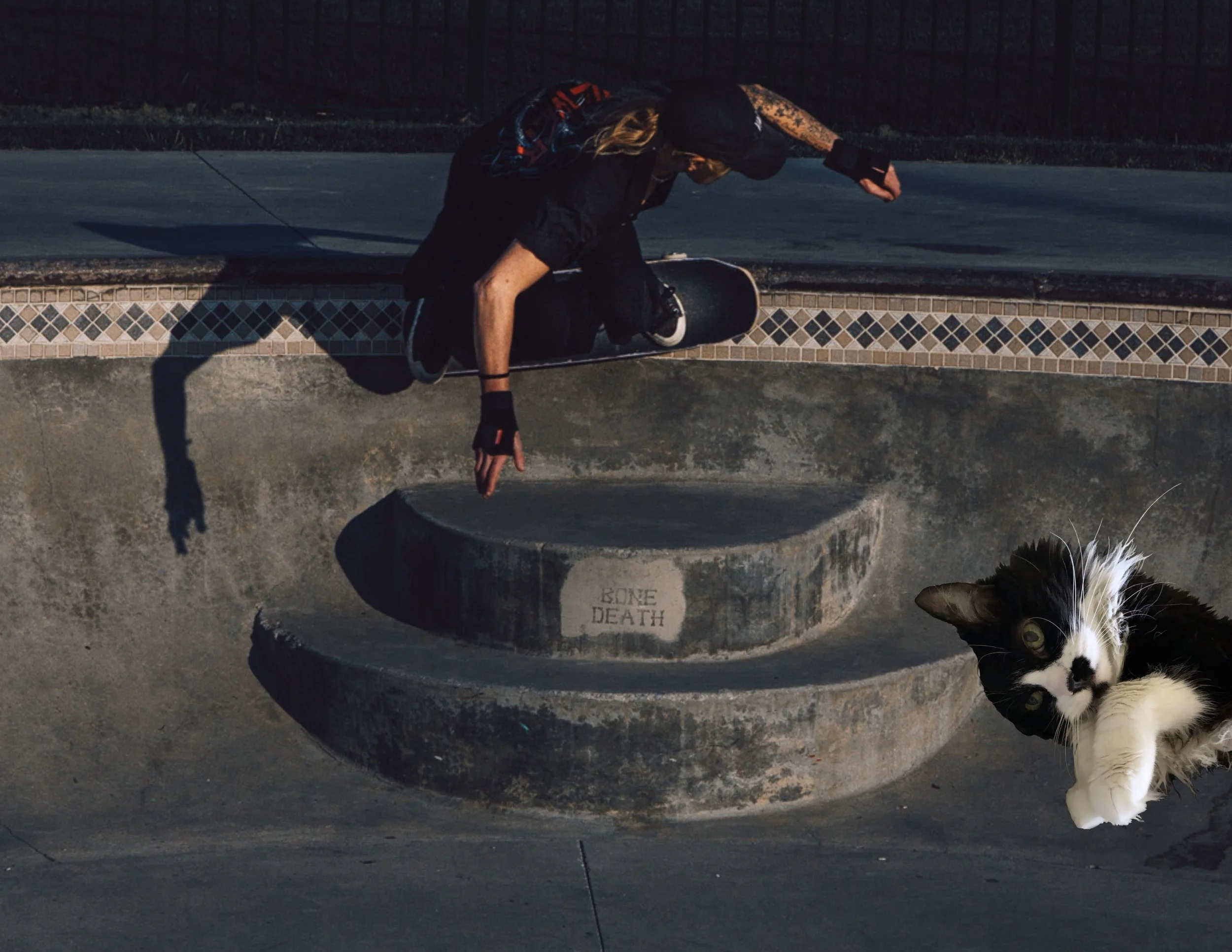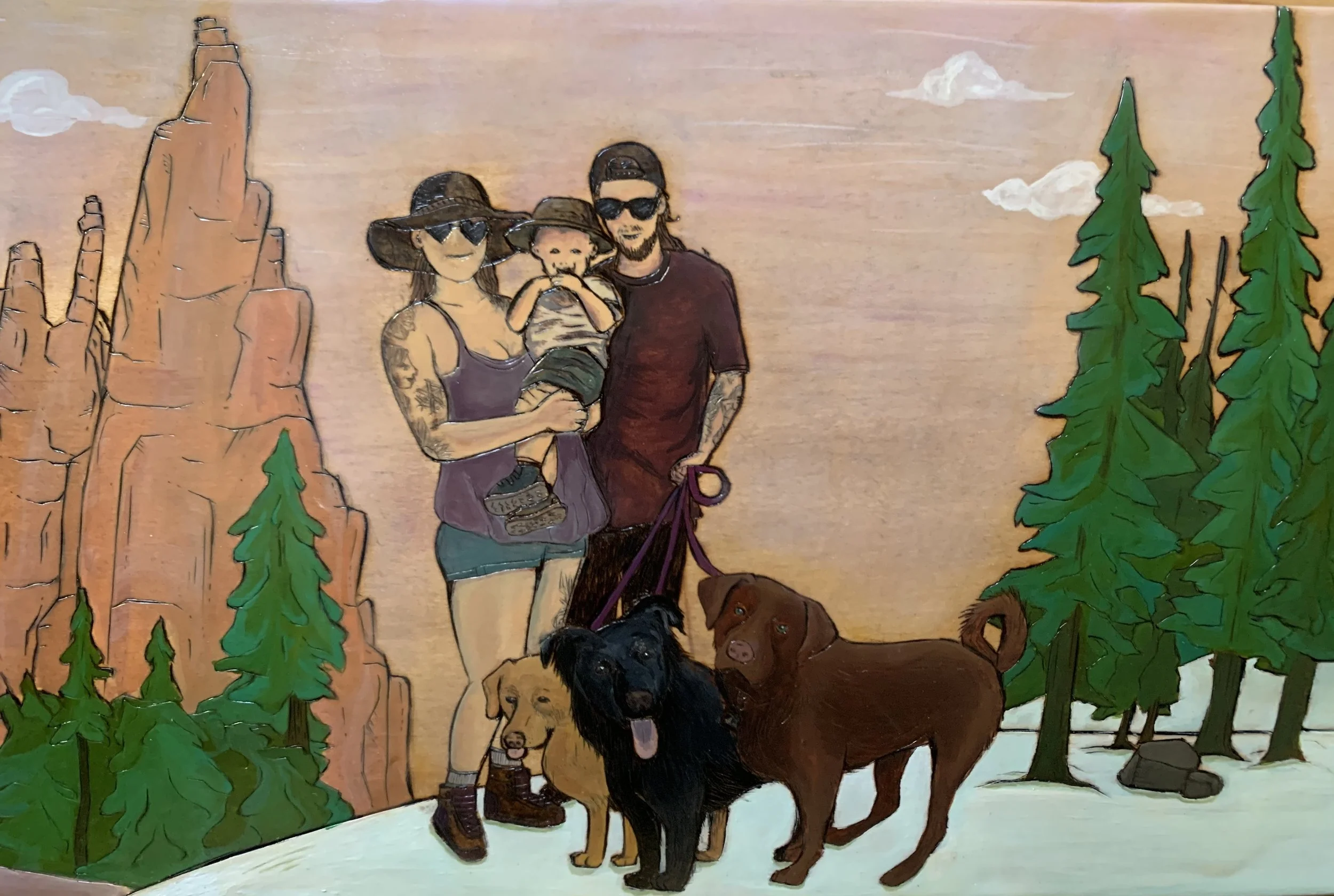This painting was based off a photograph and commissioned as a Christmas present. The skate deck is cut and framed out.