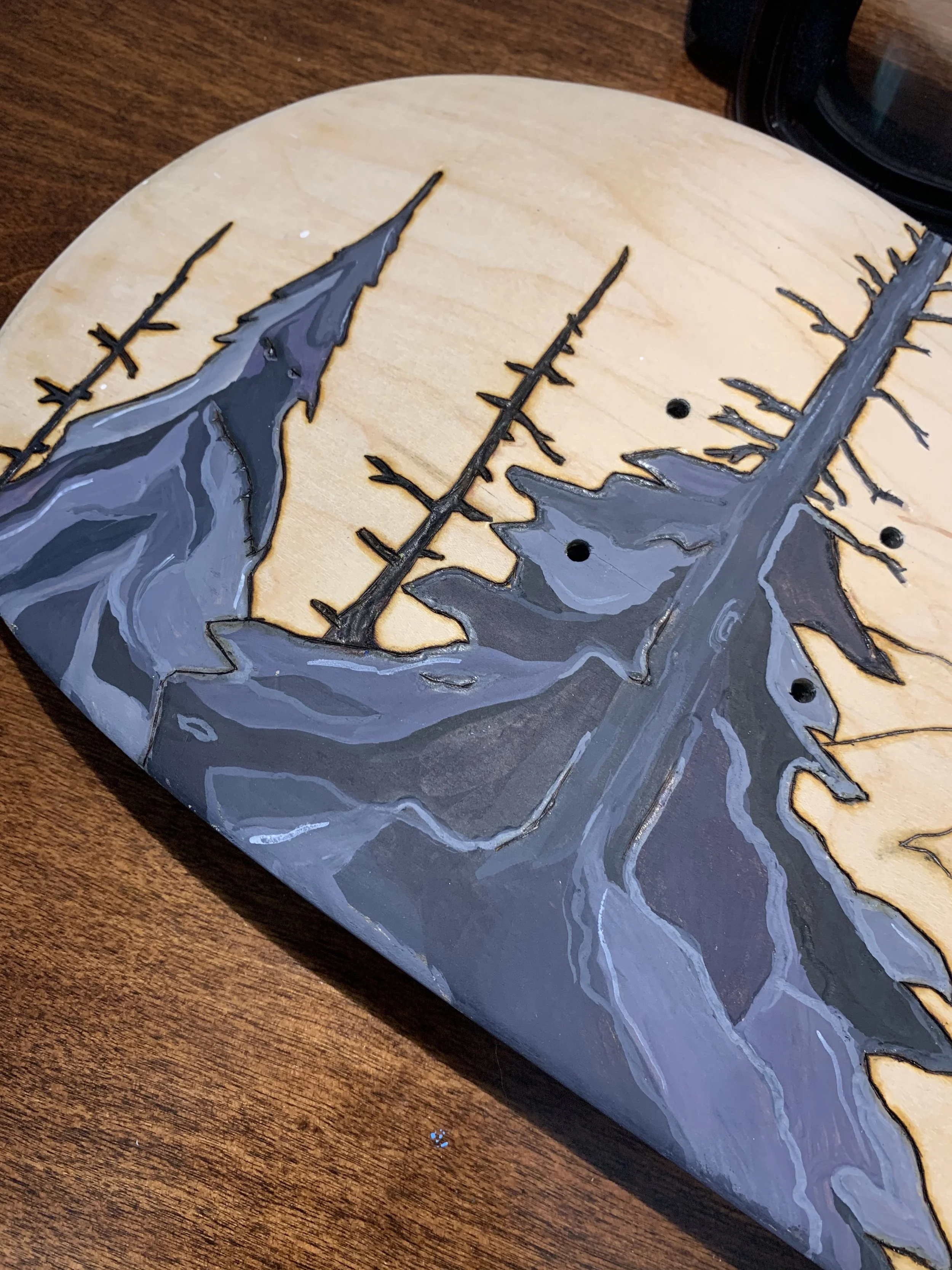 Wood burned and painted customs on a skate nose/tail or 6" x 6" wooden canvas.